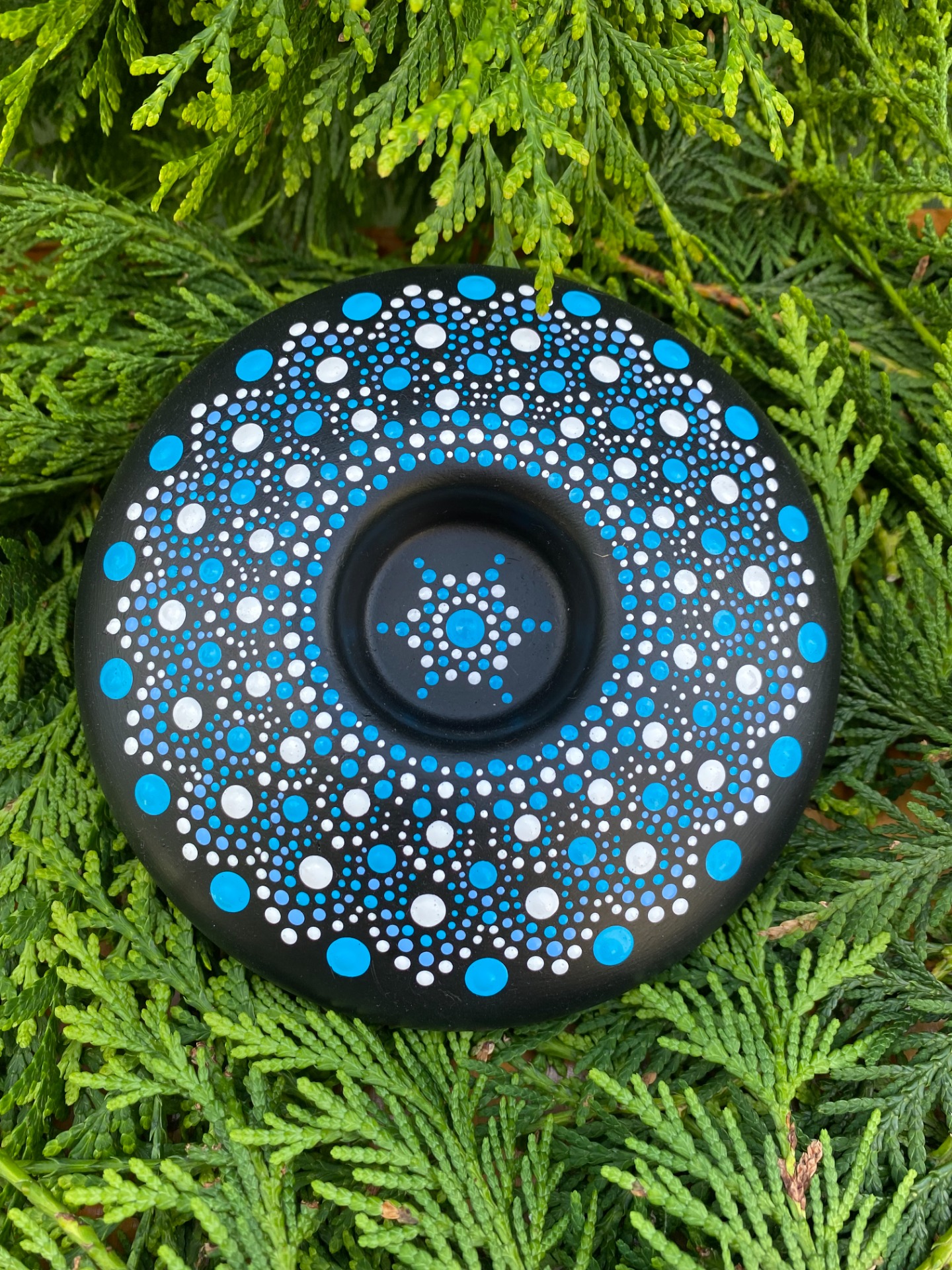 Svícen kulatý na čajovou svíčku,černý podklad, modro-bílá mandala.